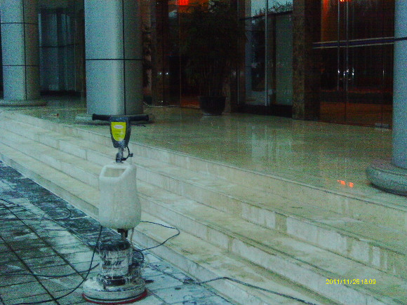 到了70年代末,一種可塑性水溶性結(jié)晶聚合物的誕生,亦即是現(xiàn)今常說的水蠟,進(jìn)化了石材護(hù)理的歷史,可以利用這種物質(zhì)對(duì)不同材質(zhì)的大理石進(jìn)行護(hù)理。分底蠟(封蠟),面蠟(拋光蠟)及保養(yǎng)蠟(日常修補(bǔ)蠟)是對(duì)大理石的塑層進(jìn)行保護(hù)并利用高速拋光來增亮,對(duì)石材的保護(hù)起到一定的作用。但是這種水蠟不足之處是蠟層的硬度有限,稍欠保養(yǎng),腳步帶進(jìn)的塵土將很容易把蠟層及石材磨花。同時(shí),遇上雨水季節(jié),因室外雨水塵埃會(huì)有一定的雜質(zhì),通過人的腳步帶進(jìn)后,對(duì)蠟層的分子組成將造成一定的影響。直觀看到是蠟層變黃及缺光澤,也就是以后常見到的許多客戶為什么須經(jīng)常將腐蝕的蠟層用起蠟水脫去,再重新分工序打上底蠟和面蠟,每次的工作量及耗用的物料較大,這種工藝現(xiàn)市場上很普通,我們稱為石材打蠟第二代。